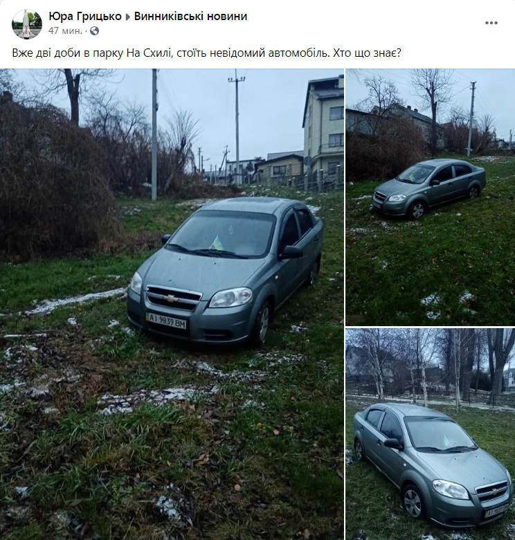 «Вже дві доби в парку «На схилі», стоїть невідомий автомобіль. Хто що знає?»,- зазначається у дописі Юрія Грицько на сторінці спільноти «Винниківські новини», який оприлюднив світлини з місця події.