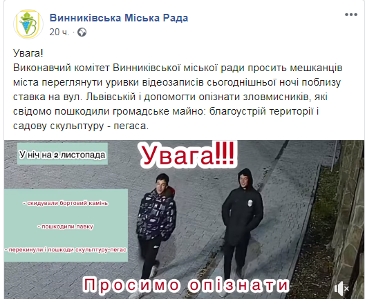 «Виконавчий комітет Винниківської міської ради просить мешканців міста переглянути уривки записів відеокамер, встановлених у цьому районі, і допомогти опізнати зловмисників, які свідомо пошкодили громадське майно», – зазначається у повідомленні.