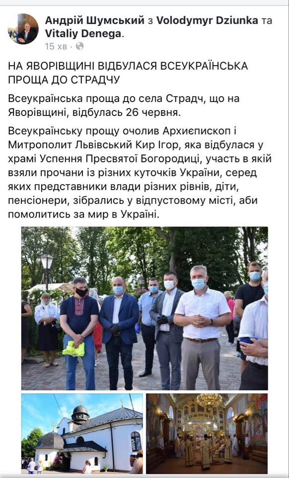 “Всеукраїнську прощу очолив Архиєпископ і Митрополит Львівський Кир Ігор, яка відбулася у храмі Успення Пресвятої Богородиці, участь в якій взяли прочани із різних куточків України, серед яких представники влади різних рівнів, діти, пенсіонери, зібрались у відпустовому місті, аби помолитись за мир в Україні”, – йдеться у дописі.