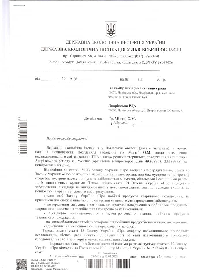 “Яворівську РДА зобов’язано забезпечити ліквідацію сміттєзвалища побутових відходів і тваринних решток в селі Рокитне… Кому треба заморожене сало поспішіть”, – йдеться у повідомленні.