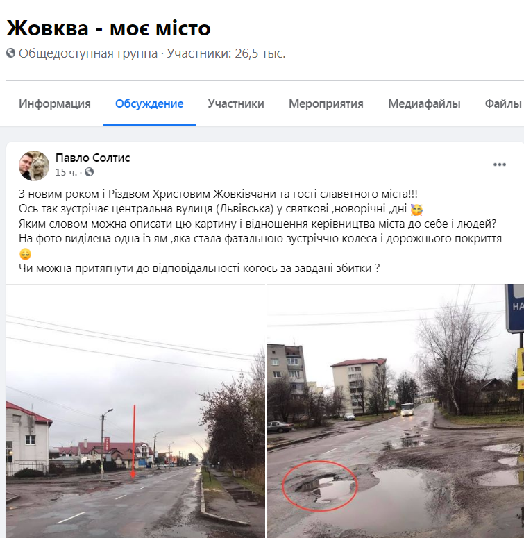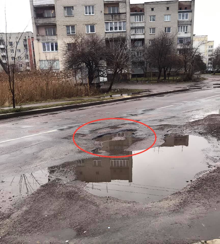 «Ось так зустрічає центральна вулиця (Львівська) у святкові дні. Яким словом можна описати цю картину і відношення керівництва міста до себе і людей? На фото виділена одна із ям, яка стала фатальною зустріччю колеса і дорожнього покриття. Чи можна притягнути до відповідальності когось за завдані збитки?», – зазначає у дописі на сторінці спільноти «Жовква – моє місто» Пало Солтис, який оприлюднив світлини з місця події.