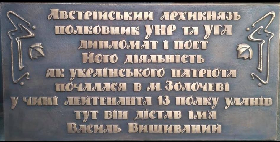 Як зазначається, меморіал присвячений 125-тим роковинам з дня народження Вільгельма фон Габсбурга 1895-1948 та 105-им роковинам прибуття його на військову службу у місто Золочів в 13 полк уланів. Вільгельм фон Габсбург – майбутній командуючий українським легіоном Січових Стрільців, український дипломат та поет, незламний український патріот. який назавжди увійшов в історію визвольних змагань українського народу, під козацьким іменем Василь Вишиваний.