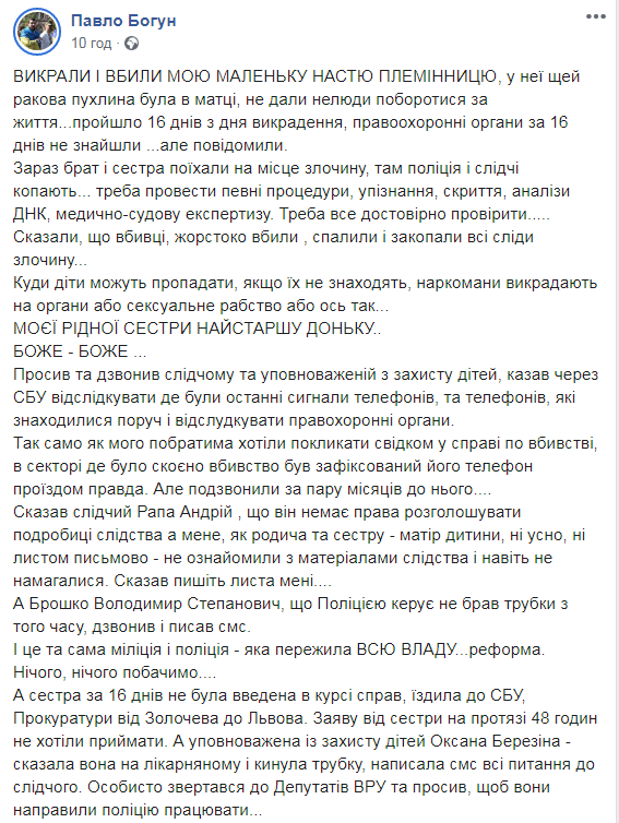 Як написав на своїй сторінці у ФБ Павло Богун, “ВИКРАЛИ І ВБИЛИ МОЮ МАЛЕНЬКУ НАСТЮ ПЛЕМІННИЦЮ, у неї щей ракова пухлина була в матці, не дали нелюди поборотися за життя…пройшло 16 днів з дня викрадення, правоохоронні органи за 16 днів не знайшли …але повідомили.