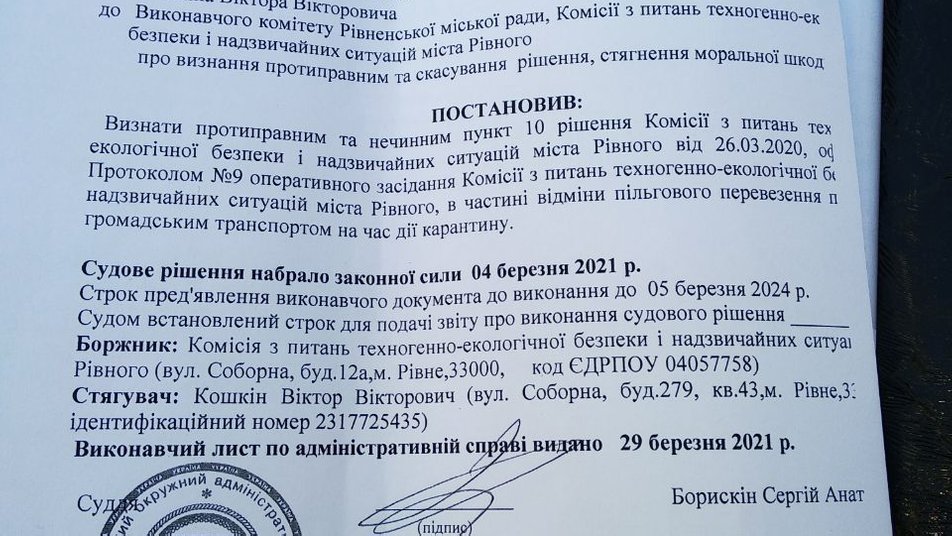 Ветеран АТО Віктор Кошкін, який судився з Рівненською міською радою через скасування пільгових перевезень в обласному центрі та виграв справу, звернувся до виконавчої служби, Офісу президента та разом з іншими ветеранами збирається звернутися до Європейського суду з прав людини.