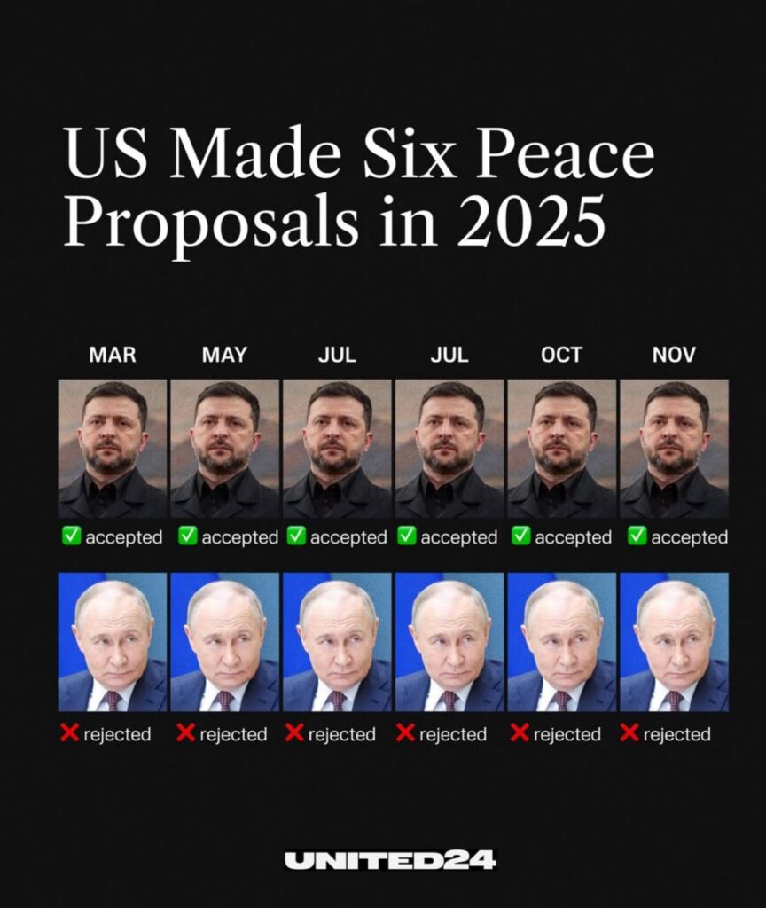 За цей рік Україна прийняла 6 (!) мирних планів США, а рф — жодного. При цьому Трамп все ще продовжує заявляти, що росія «хоче миру».