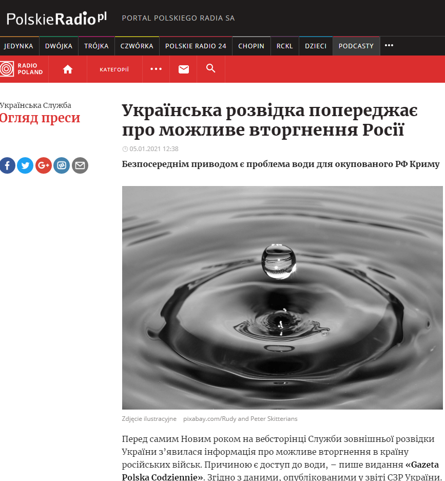 Перед самим Новим роком на вебсторінці Служби зовнішньої розвідки України з’явилася інформація про можливе вторгнення в країну російських військ. Причиною є доступ до води.