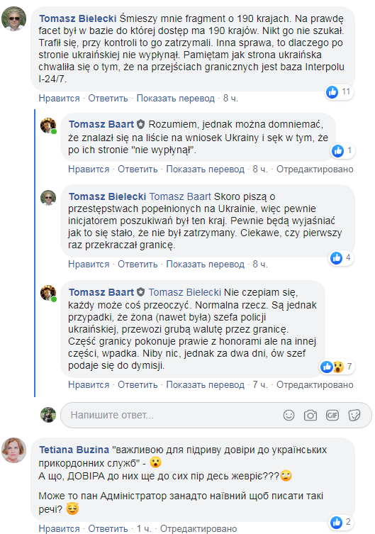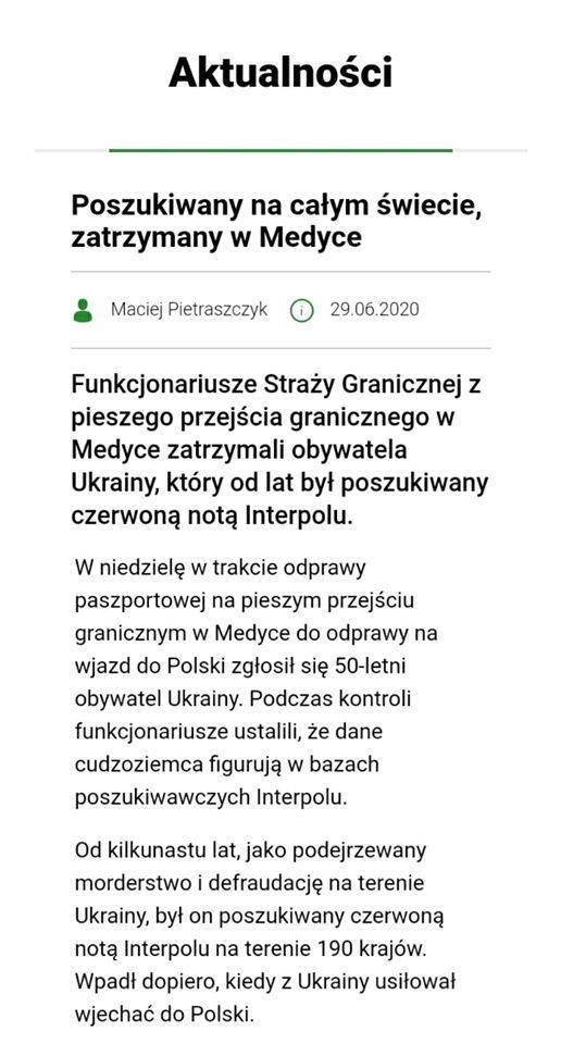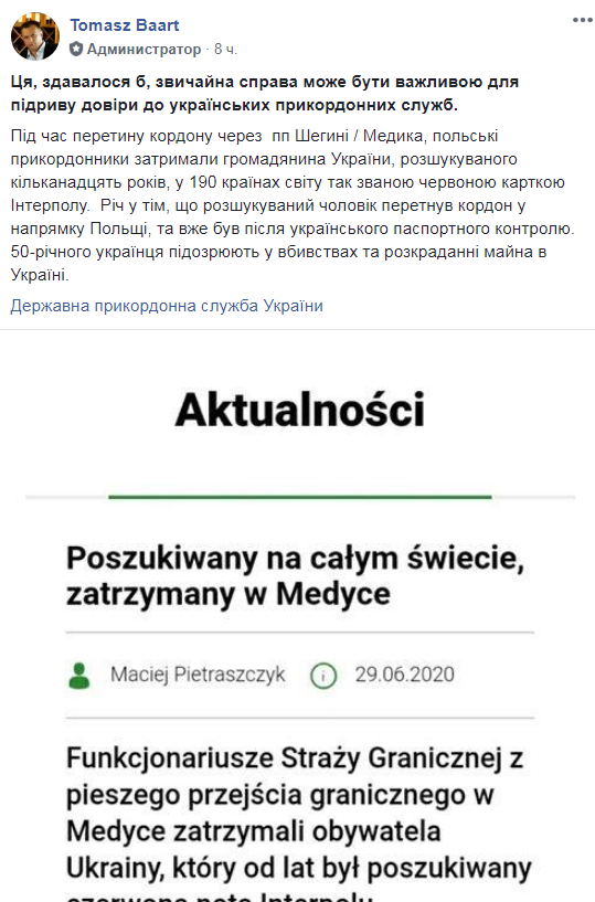 “Ця, здавалося б, звичайна справа може бути важливою для підриву довіри до українських прикордонних служб. Під час перетину кордону через ПП Шегині / Медика, польські прикордонники затримали громадянина України, розшукуваного кільканадцять років, у 190 країнах світу так званою червоною карткою Інтерполу. Річ у тім, що розшукуваний чоловік перетнув кордон у напрямку Польщі, та вже був після українського паспортного контролю. 50-річного українця підозрюють у вбивствах та розкраданні майна в Україні”,- зазначається у дописі польського активіста Томаша Баарта на сторінці Granica / Кордон PL – UA.