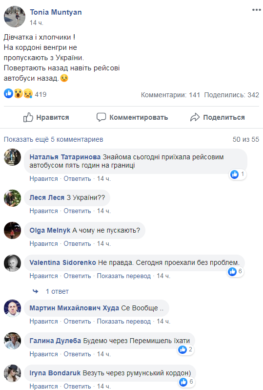 “На кордоні венгри не пропускають з України.Повертають назад навіть рейсові автобуси назад”, – повідомила на сторінці спільноти Українці в Італії (об’єднуємось в єдину групу!) Tonia Muntyan.