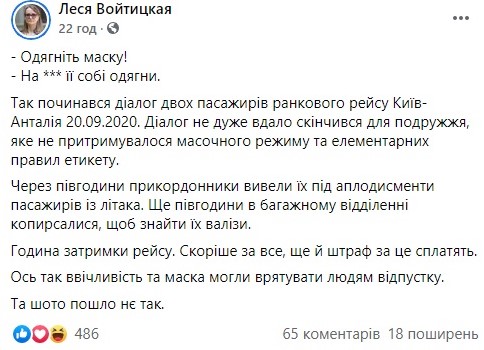 – Одягніть маску!- На *** її собі одягни.Так починався діалог двох пасажирів ранкового рейсу Київ-Анталія 20.09.2020….