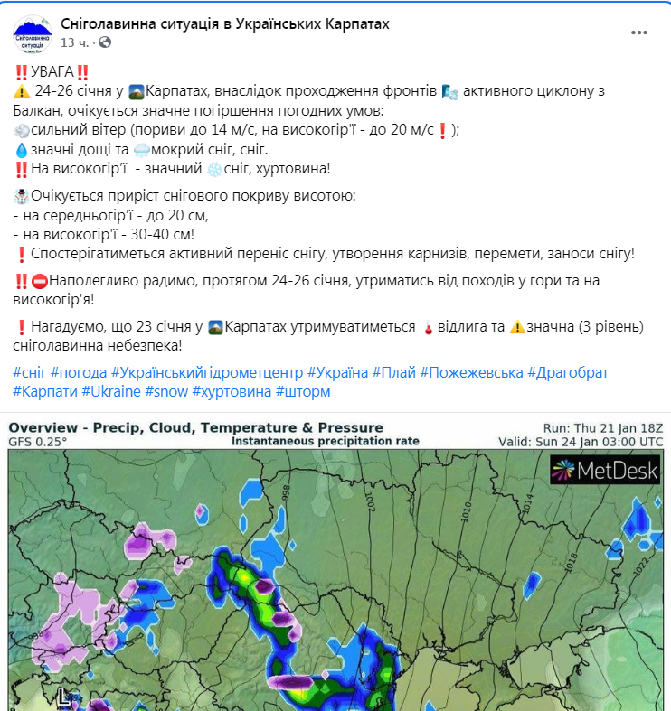 ⚠️ 24-26 січня у 🏔Карпатах, внаслідок проходження фронтів 🌬 активного циклону з Балкан, очікується значне…Опубликовано Сніголавинна ситуація в Українських Карпатах Пятница, 22 января 2021 г.