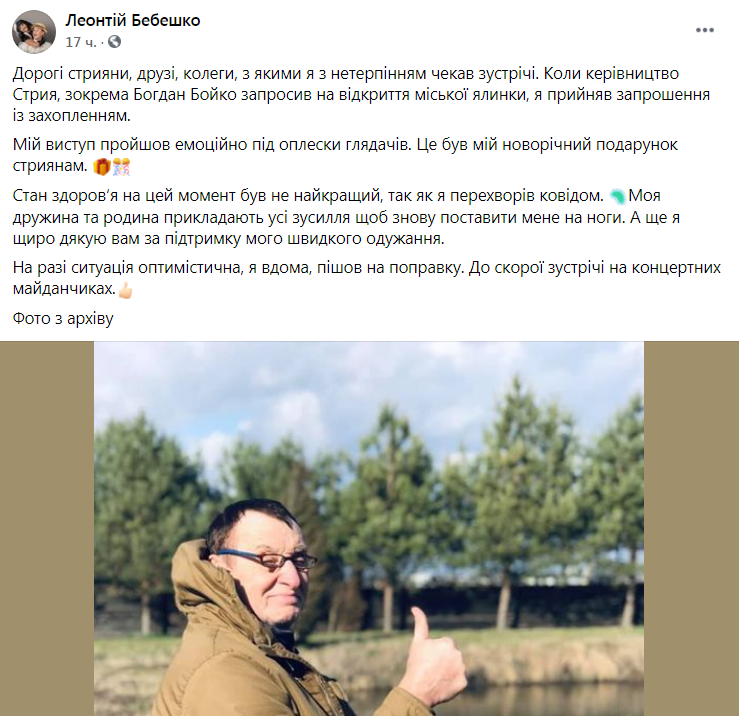 Напередодні святого Миколая, 18 грудня, Леонтій Бебешко виступав на відкритті новорічної ялинки у Стрию. Як він зазначив на своїй сторінці у Фейсбуці, тоді почувався не найкраще, бо перехворів на коронавірус.