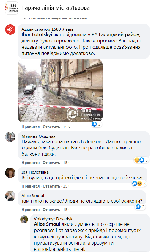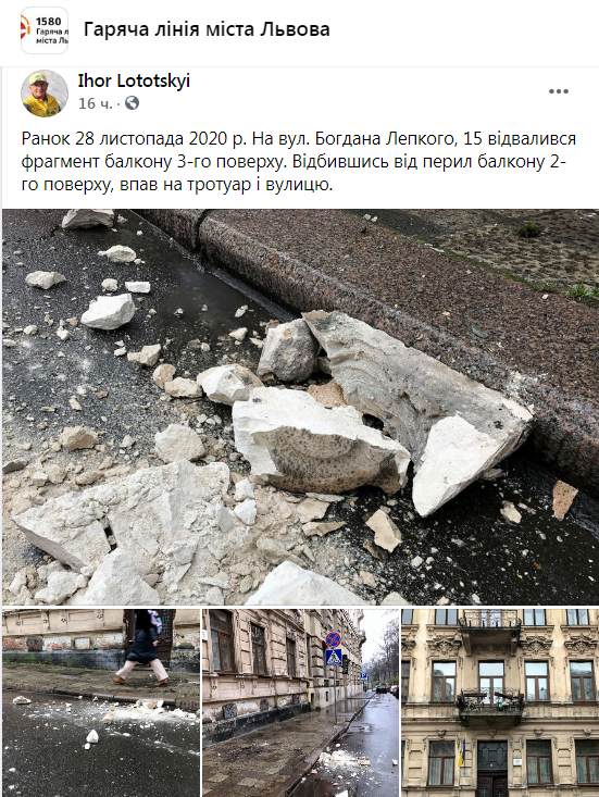 «Ранок 28 листопада 2020 р. На вул. Богдана Лепкого, 15 відвалився фрагмент балкону 3-го поверху. Відбившись від перил балкону 2-го поверху, впав на тротуар і вулицю», – зазначається у тексті звернення на «Гарячу лінію міста Львова».