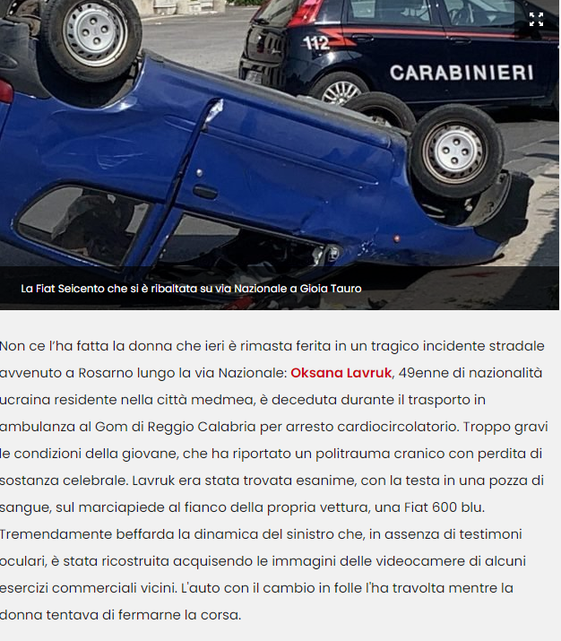 Як пише «Четверта студія», з посиланням на УНІАН, на 49-річну Оксану Лаврук з Прикарпаття раптово покотився автомобіль. Жінку згодом знайшли непритомною в калюжі крові і намагалися врятувати. Однак травми виявилися несумісними з життям. Українські заробітчани в Італії збирають кошти для перевезення тіла Оксани Лаврук в село Далешове Коломийського району Івано-Франківської області.