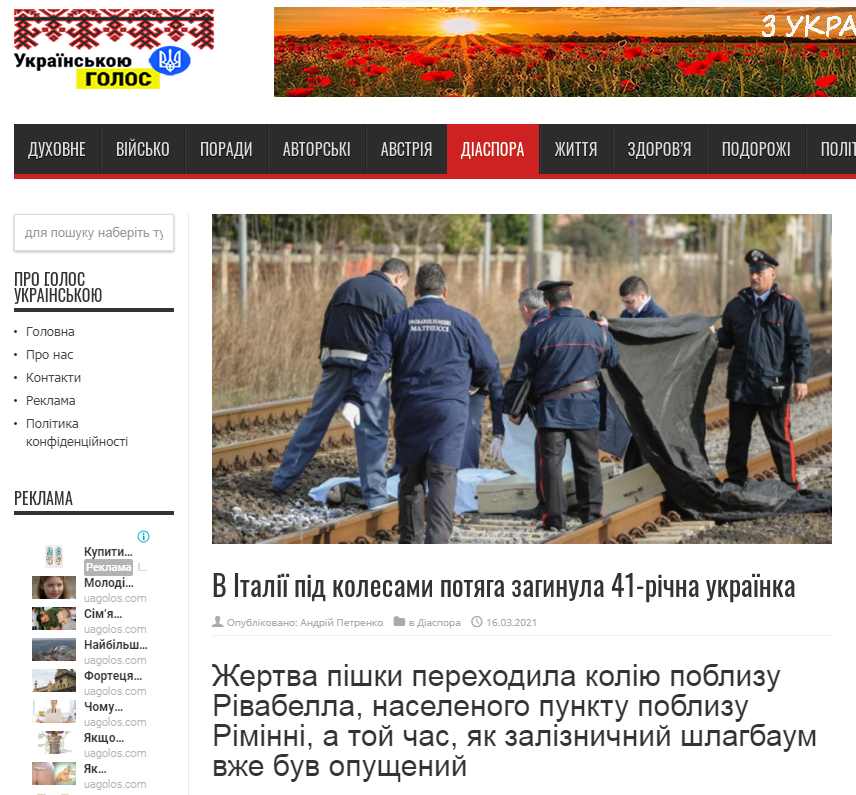 В Італії під колесами потяга загинула 41-річна українка. Жінка пішки переходила колію поблизу Рівабелла, населеного пункту поблизу Рімінні, в той час, як залізничний шлагбаум вже був опущений.