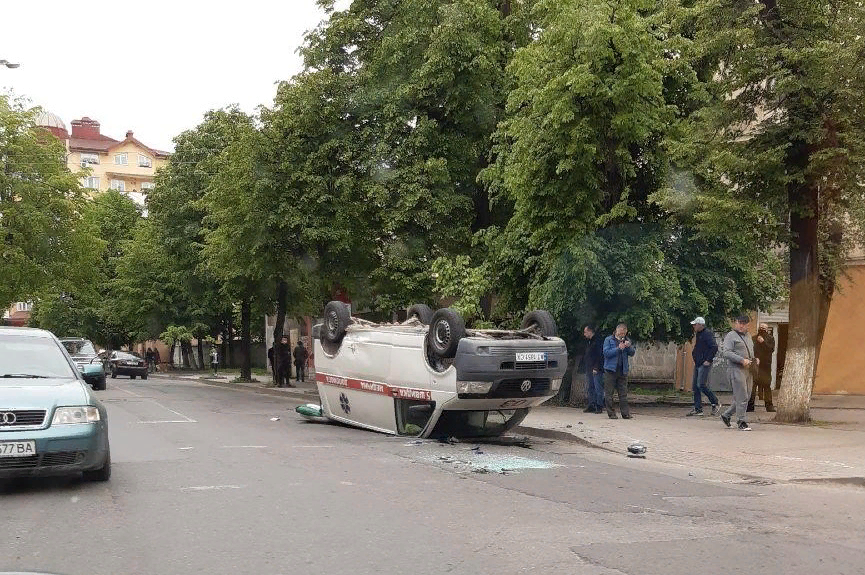 Автомобіль «Фолькваген» зіткнувся зі спецавтомобілем екстренної медичної допомоги. У результаті зіткнення спецавтомобіль перекинувся.
