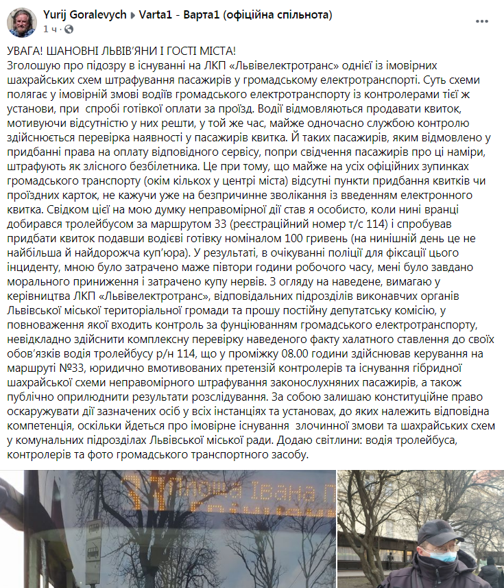 «З огляду на наведене, вимагаю у керівництва ЛКП «Львівелектротранс», відповідальних підрозділів виконавчих органів Львівської міської територіальної громади та прошу постійну депутатську комісію, у повноваження якої входить контроль за функціюванням громадського електротранспорту, невідкладно здійснити комплексну перевірку наведеного факту халатного ставлення до своїх обов’язків водія тролейбусу р/н 114, що у проміжку 08.00 години здійснював керування на маршруті №33, юридично вмотивованих претензій контролерів та існування гібридної шахрайської схеми неправомірного штрафування законослухняних пасажирів, а також публічно оприлюднити результати розслідування. За собою залишаю конституційне право оскаржувати дії зазначених осіб у всіх інстанціях та установах, до яких належить відповідна компетенція, оскільки йдеться про імовірне існування злочинної змови та шахрайських схем у комунальних підрозділах Львівської міської ради. Додаю світлини: водія тролейбуса, контролерів та фото громадського транспортного засобу», – зазначає у дописі Yurij Goralevych, який оприлюднив світлини з місця події.