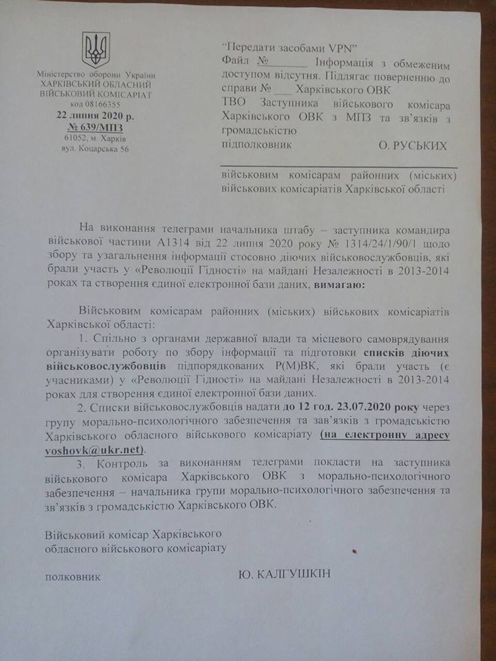 Так, він оприлюднив документ, спрямований військовим комісарам районних (міських) військових комісаріатів Харківської області.