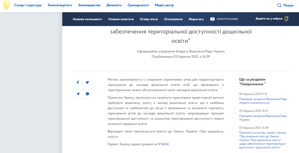 Верховна Рада ухвалила в першому читанні законопроєкт “Про внесення змін до Закону України “Про дошкільну освіту” щодо забезпечення територіальної доступності дошкільної освіти”.
