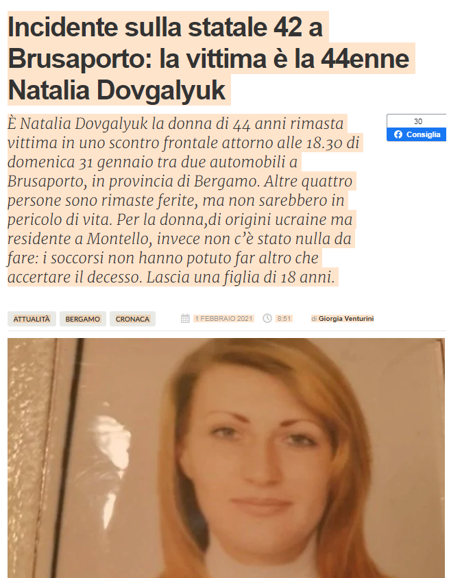 «В Серіатах (провінція Бергамо) у ДТП трагічно загинула українка Наталія Довгалюк, 1976 року народження. Допоможіть знайти друзів чи родичів! Є інформація, що вона residente a Montello. Аварія на шосе 42 у Брусапорто: жертвою є 44-річна Наталія Довгалюк»,- зазначається у повідомленні на сторінці спільноти Українці в Італії (об’єднуємось в єдину групу!).