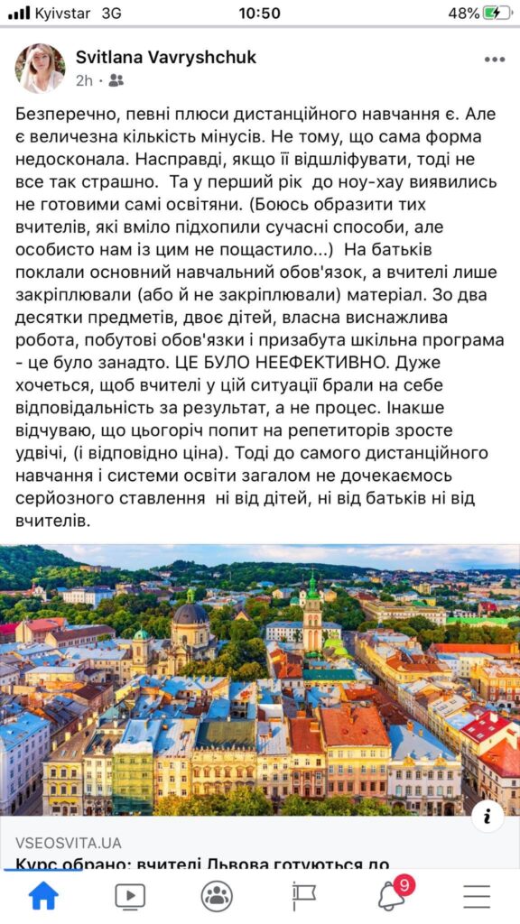 «Безперечно, певні плюси дистанційного навчання є. Але є величезна кількість мінусів. Не тому, що сама форма недосконала. Насправді, якщо її відшліфувати, тоді не все так страшно. Та у перший рік до ноу-хау виявились не готовими самі освітяни. (Боюсь образити тих вчителів, які вміло підхопили сучасні способи, але особисто нам із цим не пощастило…). На батьків поклали основний навчальний обов’язок, а вчителі лише закріплювали (або й не закріплювали) матеріал. Зо два десятки предметів, двоє дітей, власна виснажлива робота, побутові обов’язки і призабута шкільна програма – це було занадто. Це було неефективно. Дуже хочеться, щоб вчителі у цій ситуації брали на себе відповідальність за результат, а не процес. Інакше відчуваю, що цьогоріч попит на репетиторів зросте удвічі, (і відповідно ціна). Тоді до самого дистанційного навчання і системи освіти загалом не дочекаємось серйозного ставлення ні від дітей, ні від батьків ні від вчителів», – зазначила у своєму дописі у ФБ Світлана Ваврищук.