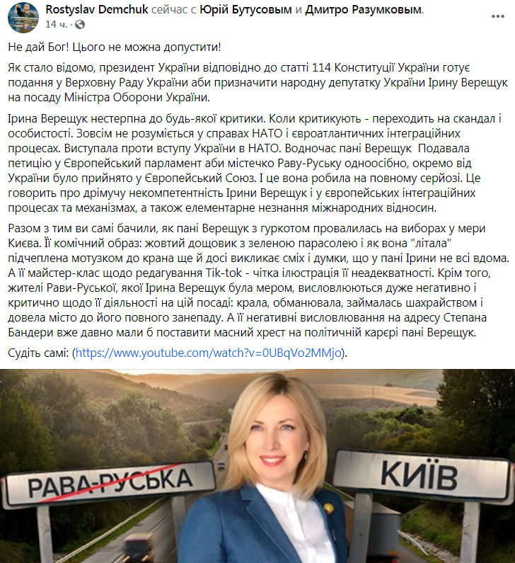 «Як стало відомо, президент України відповідно до статті 114 Конституції України готує подання у Верховну Раду України аби призначити народну депутатку України Ірину Верещук на посаду Міністра Оборони України.