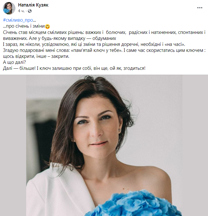 Як розповіла Наталія Кузяк 26 січня став для неї останнім днем роботи в департаменті облдержадміністрації. У неї багато цікавих ідей, які вона планує реалізовувати після звільнення. Про емоційний стан на «волі» вона написала на своїй сторінці у Фейсбуці.