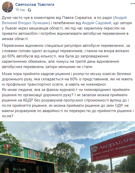 Як зазначається у дописі, “дуже часто чув в коментарях від Павла Сирватка, а по радіо (Андрій Великий Влодко Лучишин) і телебаченні від Андрій Садовий, що затори у Львові через мешканців області, які під час карантину пересіли на приватні автомобілі і потрібно відновлювати автобусне перевезення в межах області. Перевізники відновили спеціальні регулярні автобусні перевезення, за словами голови однієї асоціації перевізників, станом на вчора виїхало до 60% автобусів від кількості, яка була до запровадження карантинних обмежень, але чомусь на третій день відновлення автобусних перевезень затори меншими не стали”.