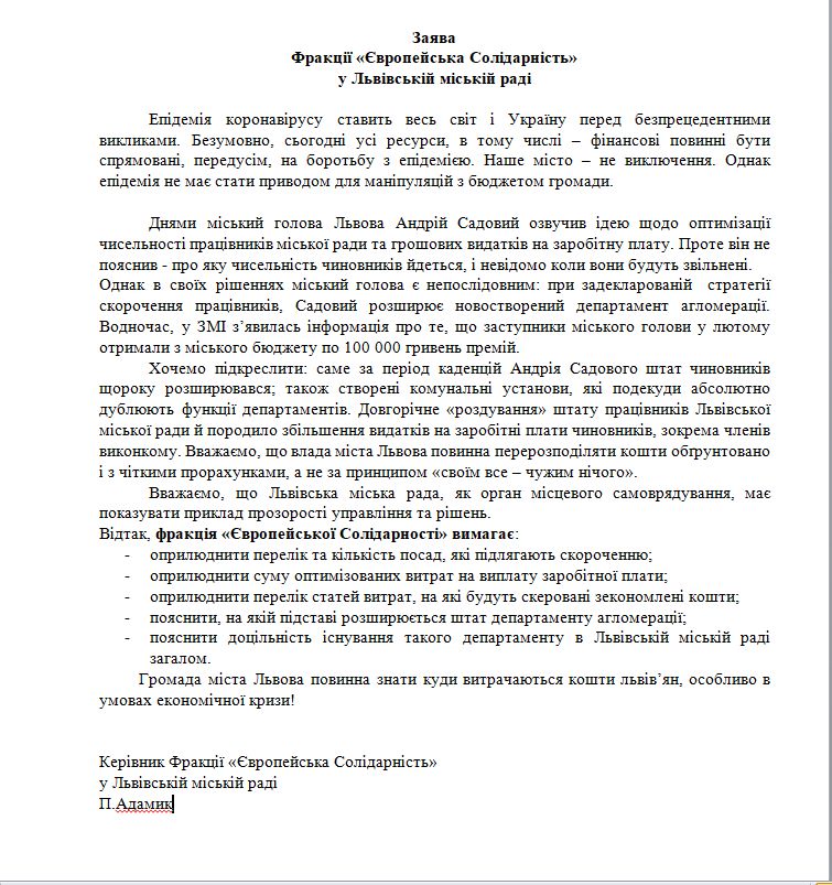 Як пише «Четверта студія», на своїй сторінці у ФБ керівник фракції БПП «Солідарність» Петро Адамик оприлюднив текст заяви фракції «Європейська солідарність» у Львівській міській раді щодо “дивної” економії міського бюджету.