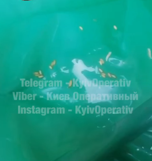 На кадрах видно, як двоє чоловіків у темно-синій формі з шевронами відкривають зелений поліетиленовий пакунок з державним гербом і написом. Він “запаяний”, тому його розрізають канцелярським ножем. Всередині видно щось біле, схоже на личинки.