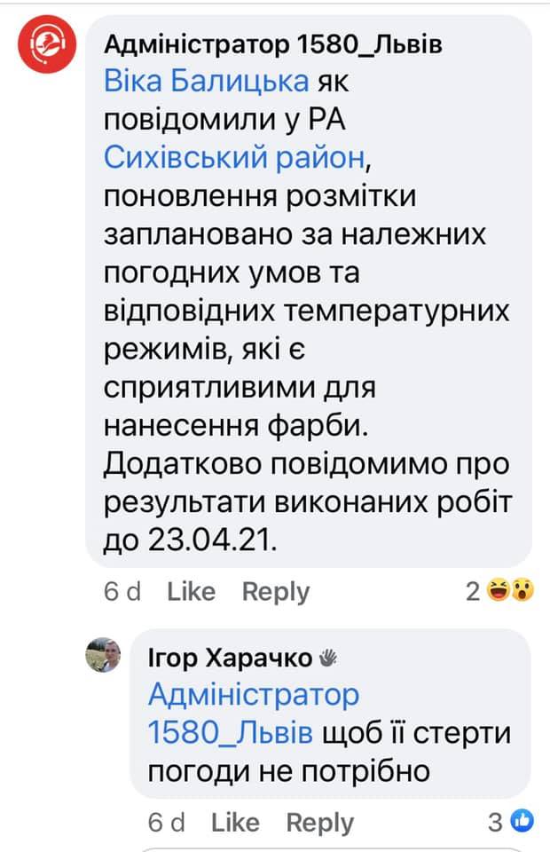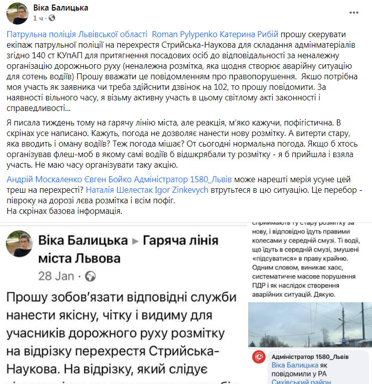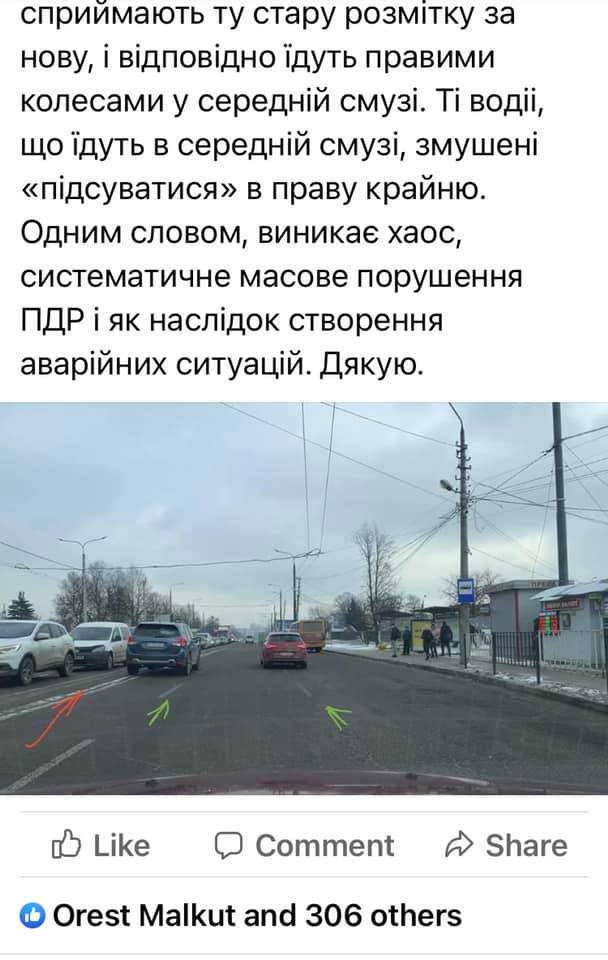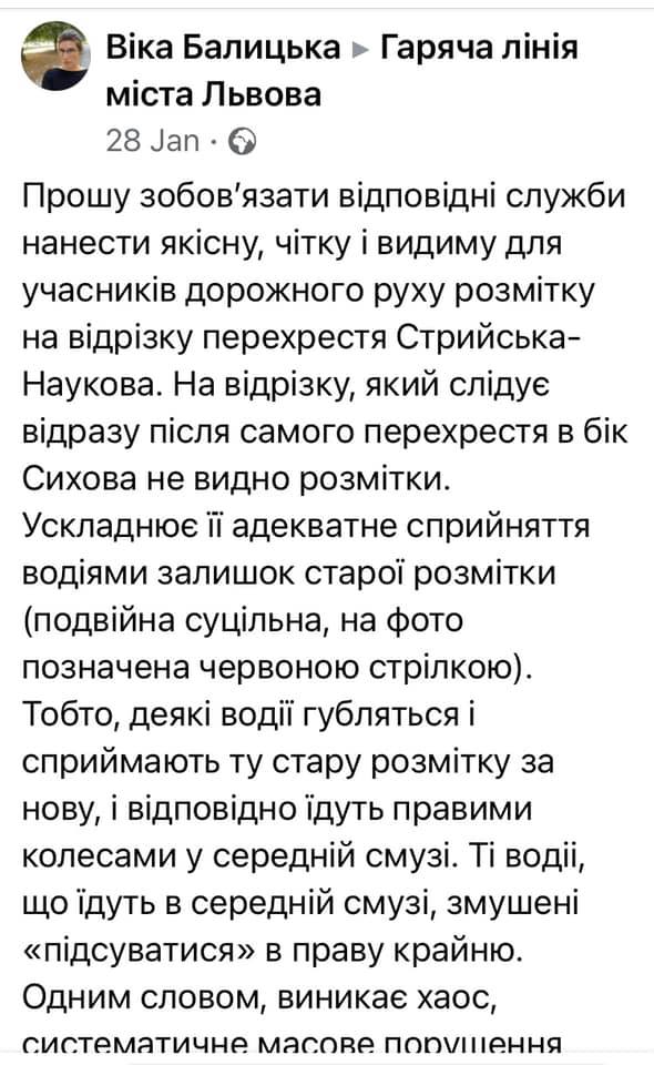 Я писала тиждень тому на гарячу лінію міста, але реакція, м’яко кажучи, пофігістична. В скрінах усе написано. Кажуть, погода не дозволяє нанести нову розмітку. А витерти стару, яка вводить і оману водіїв? Теж погода мішає? От сьогодні нормальна погода. Якщо б хтось організував флеш-моб в якому самі водіїв б відшкрябали ту розмітку – я б прийшла і взяла участь. Не маю часу організувати таку акцію», – втрутьтеся в цю ситуацію. Це перебор – півроку на дорозі лєва розмітка і всім пофіг. На скрінах базова інформація», – зазначається у дописі Вікторії Балицької у ФБ.