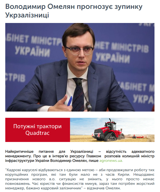 “Укрзалізниця – це державна компанія і монополіст. Якщо, не доведи Бог, зупиняється залізниця (а ця зупинка зараз, на мій погляд, неминуча), у нас просто зупиняється вся економіка. Бо залізниця не просто генерує 5–6,5% від ВВП, від неї залежить логістика. Якщо ви зібрали врожай і у вас немає залізниці – у вас немає чим його вивезти. Всі ці історії про зерновози, які руйнують дороги, – це правда. Але вони перевозять максимум 10–20%, а все інше йде залізничним транспортом” -відзначив Омелян.