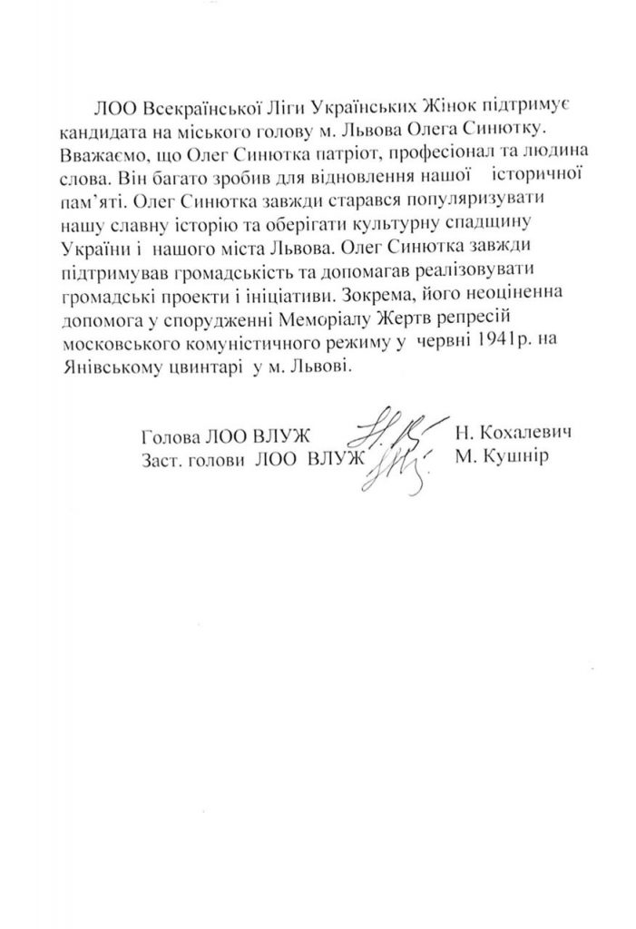 - Всеукраїнська Ліга українських жінок підтримала кандидата у мери Львова Олега Синютку