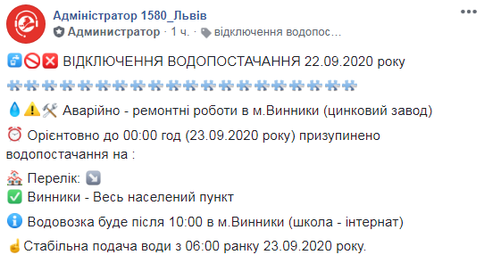 “Аварійно – ремонтні роботи в м.Винники (цинковий завод). Орієнтовно до 00:00 год (23.09.2020 року) призупинено водопостачання на: Винники (весь населений пункт).