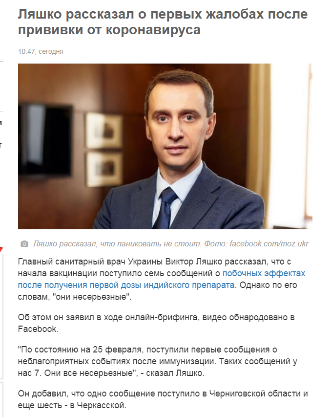 “Станом на 25 лютого, надійшли перші повідомлення про несприятливі події після імунізації. Таких повідомлень у нас 7. Вони всі несерйозні”, – сказав Ляшко.