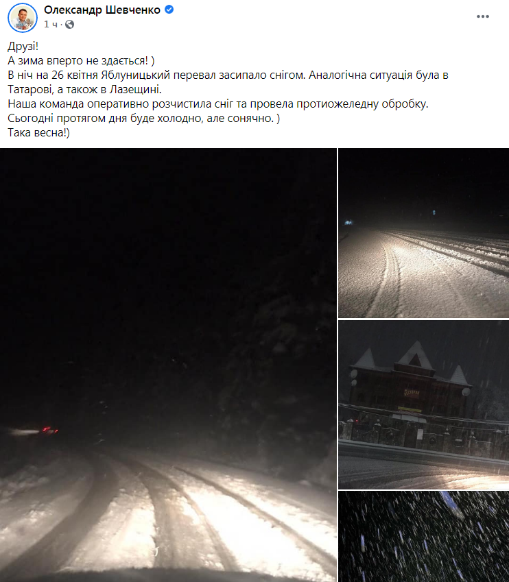 «Зима вперто не здається! В ніч на 26 квітня Яблуницький перевал засипало снігом. Аналогічна ситуація була в Татарові, а також в Лазещині», – зазначає у коментарі до світлин на своїй сторінці у ФБ Олександр Шевченко.