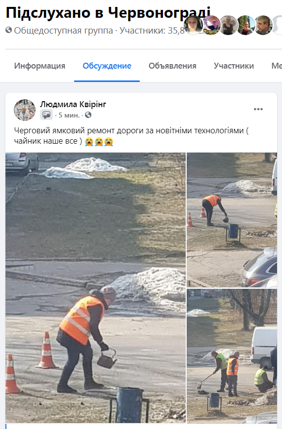 Як пише «Четверта студія», у Червонограді 12 січня користувачі соцмереж сфотографували «процес» ямкового ремонту на дорогах міста. Світлини оприлюднено на сторінці спільноти «Підслухано в Червонограді» у ФБ.