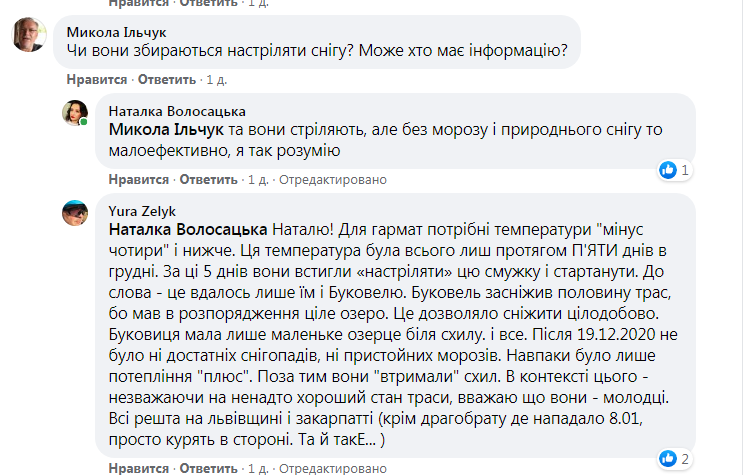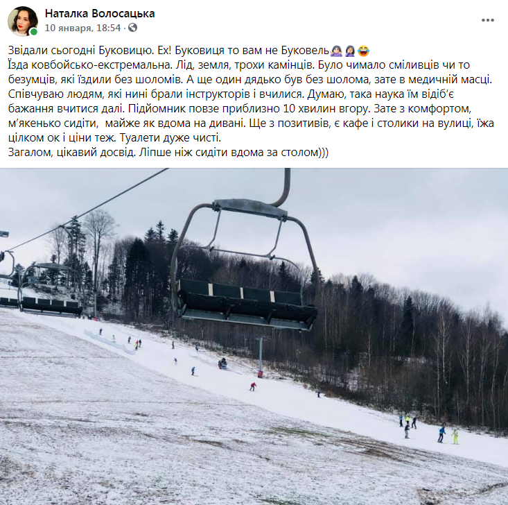 Як написала на своїй сторінці у ФБ Наталка Волосацька, “звідали Буковицю. Ех! Буковиця то вам не Буковель. Їзда ковбойсько-екстремальна. Лід, земля, трохи камінців. Було чимало сміливців чи то безумців, які їздили без шоломів. А ще один дядько був без шолома, зате в медичній масці. Співчуваю людям, які нині брали інструкторів і вчилися. Думаю, така наука їм відіб‘є бажання вчитися далі. Підйомник повзе приблизно 10 хвилин вгору. Зате з комфортом, м’якенько сидіти, майже як вдома на дивані. Ще з позитивів, є кафе і столики на вулиці, їжа цілком ок і ціни теж. Туалети дуже чисті. Загалом, цікавий досвід. Ліпше ніж сидіти вдома за столом”.