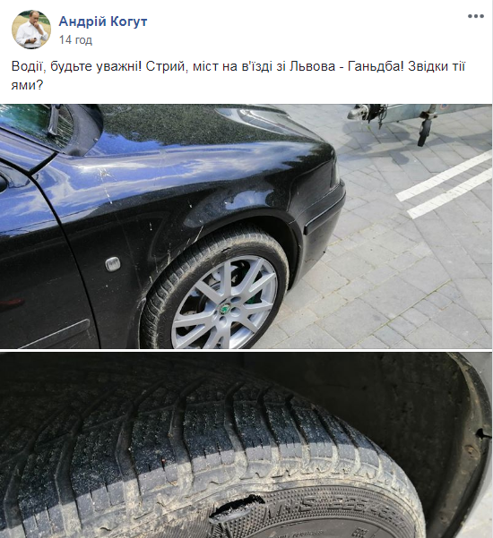 “Водії, будьте уважні. Стрий, міст на в’їзді зі Львова. Ганьдба! Звідки ті ями?”, – зазначає у дописі на сторінці ГО “Варта 1” Андрій Когут, який оприлюднив світлини з місця події.