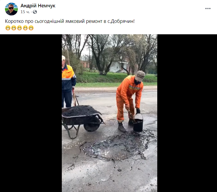 «Коротко про сьогоднішній ямковий ремонт в с.Добрячин», – зазначається у коментарі до відео з місця події.