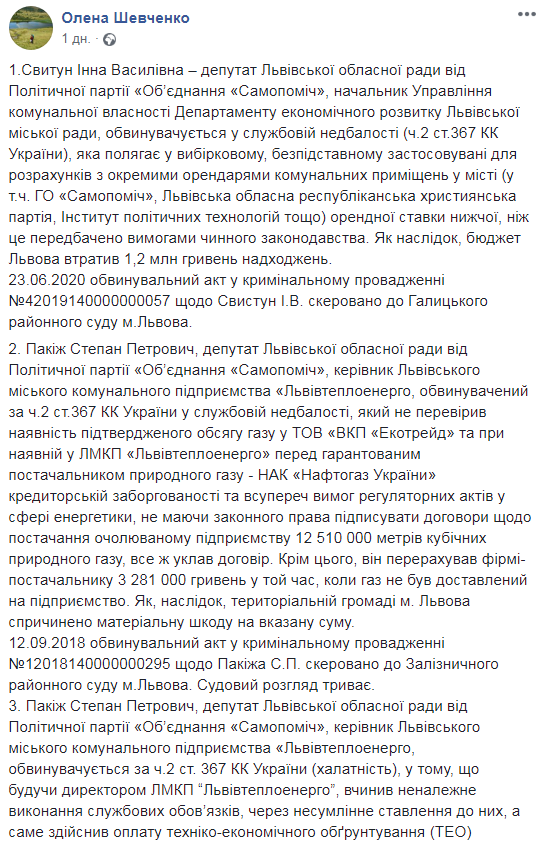 1.Свистун Інна Василівна – депутат Львівської обласної ради від Політичної партії «Об’єднання «Самопоміч», начальник Управління комунальної власності Департаменту економічного розвитку Львівської міської ради, обвинувачується у службовій недбалості (ч.2 ст.367 КК України), яка полягає у вибірковому, безпідставному застосовувані для розрахунків з окремими орендарями комунальних приміщень у місті (у т.ч. ГО «Самопоміч», Львівська обласна республіканська християнська партія, Інститут політичних технологій тощо) орендної ставки нижчої, ніж це передбачено вимогами чинного законодавства. Як наслідок, бюджет Львова втратив 1,2 млн гривень надходжень. 23.06.2020 обвинувальний акт у кримінальному провадженні №42019140000000057 щодо Свистун І.В. скеровано до Галицького районного суду м.Львова.