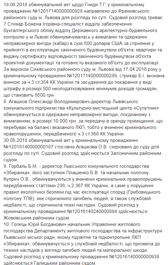 9. Горбаль Б.М. – директор Львівського комунального господарства «Збиранка», його заступник Плашенко Б.В. та начальник полігону Куприч О.В., обвинувачуються у вчиненні кримінальних правопорушень, передбачених статтями 236, ч.2 367 КК України, а саме у порушенні правил екологічної безпеки під час експлуатації споруд (Грибовицького полігону ТПВ), яке спричинило загибель людей, а також службовій недбалості, що спричинила тяжкі наслідки. Судовий розгляд у кримінальному провадженні №12016140240000884 здійснюється Жовківським районним судом.