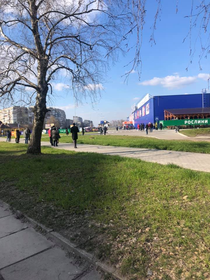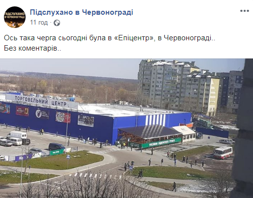 У соцмережах оприлюднили світлину, як люди у місті Червоноград 23 березня шикуються в чергу до магазину гіпермаркету “Епіцентр”.