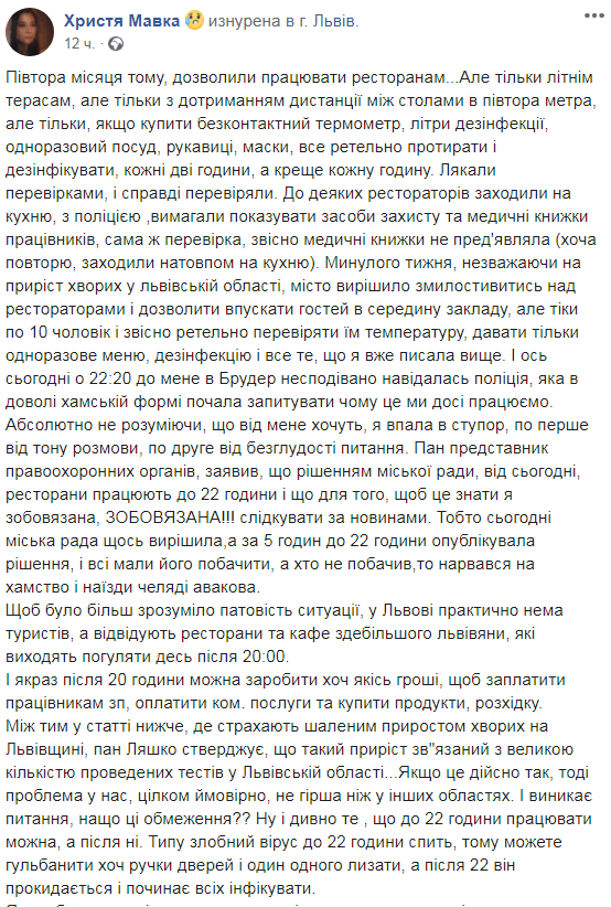“Між тим, пан Ляшко стверджує, що такий приріст пов’язаний з великою кількістю проведених тестів у Львівській області…Якщо це дійсно так, тоді проблема у нас, цілком ймовірно, не гірша ніж у інших областях. І виникає питання, нащо ці обмеження? Ну і дивно те , що до 22 години працювати можна, а після ні. Типу злобний вірус до 22 години спить, тому можете гульбанити хоч ручки дверей і один одного лизати, а після 22 він прокидається і починає всіх інфікувати. Я теж боюсь хворіти, мию по сто разів руки, ходжу в масці. не випускала 1,5 місяця з хати дитину, але ще більше я боюсь того, що ще через пів року ось такого життя, я та купа інших таких самих людей в цій країні, опиняться не те що на межі бідності, а не матимуть елементарних засобів для виживання. Ось так, ще ніколи не було.. Так гостро, ворожість власної країни до себе я ще ніколи не відчувала. Навіть в найгірші часи”,- наголошується у дописі Христини Мавки.