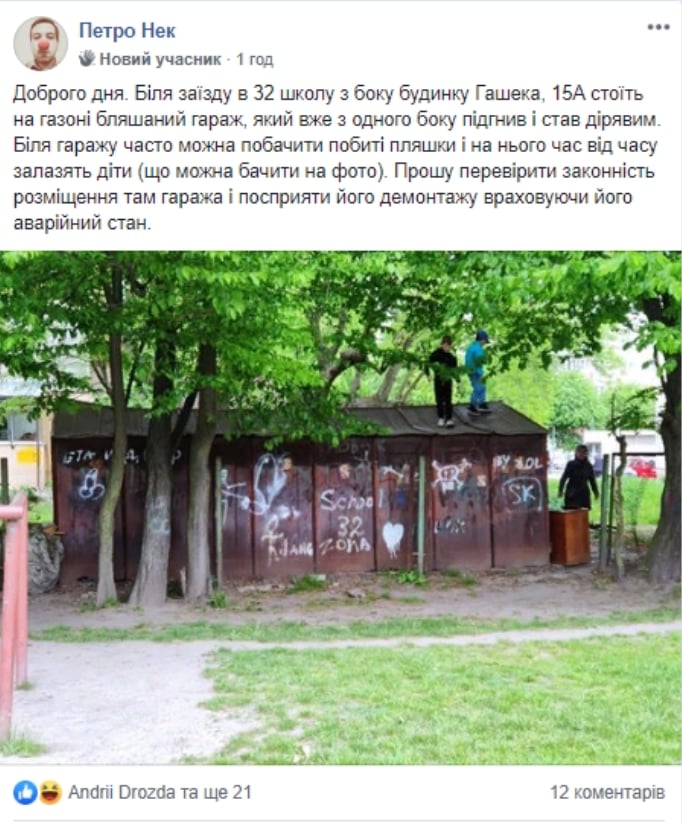 Біля гаражу часто можна побачити побиті пляшки і на нього час від часу залазять діти (що можна бачити на фото). Прошу перевірити законність розміщення там гаража і посприяти його демонтажу враховуючи його аварійний стан”, – йдеться у дописі.