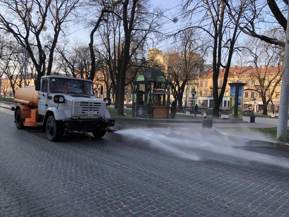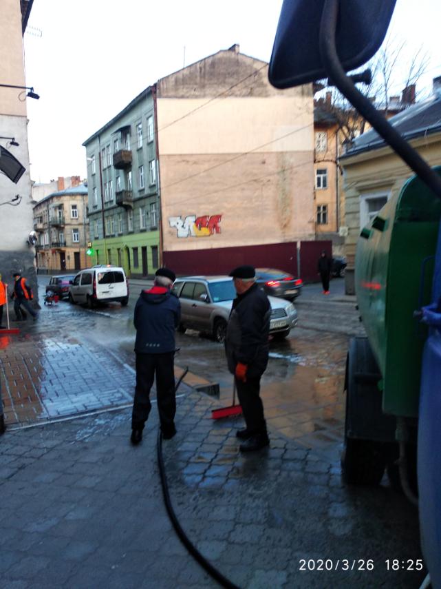 Сьогодні на вулицях Львова продовжують проводити дезінфекцію і миття вулиць, тротуарів, зупинок громадського транспорту, дитячих майданчиків.