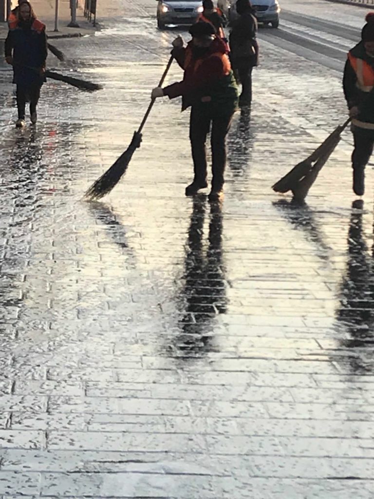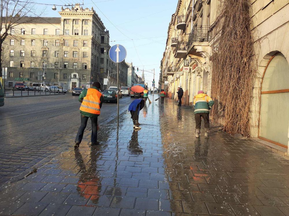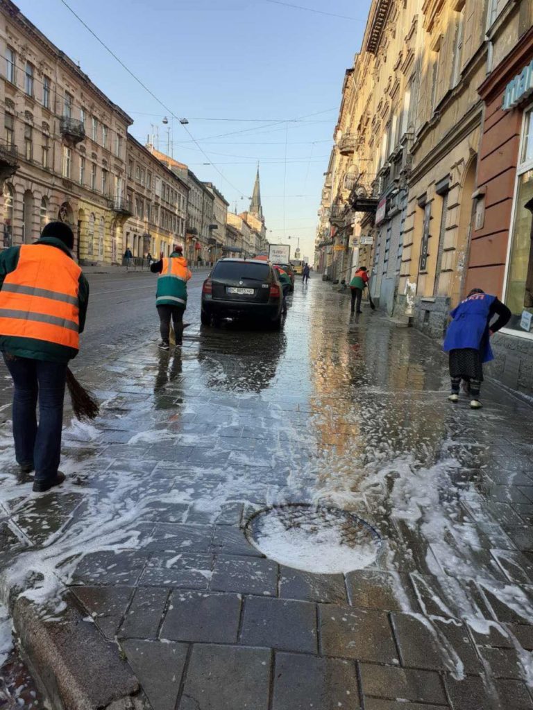 - Як у Львові комунальники без спецодягу миють місто. Фото: ЛМР.