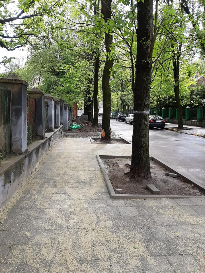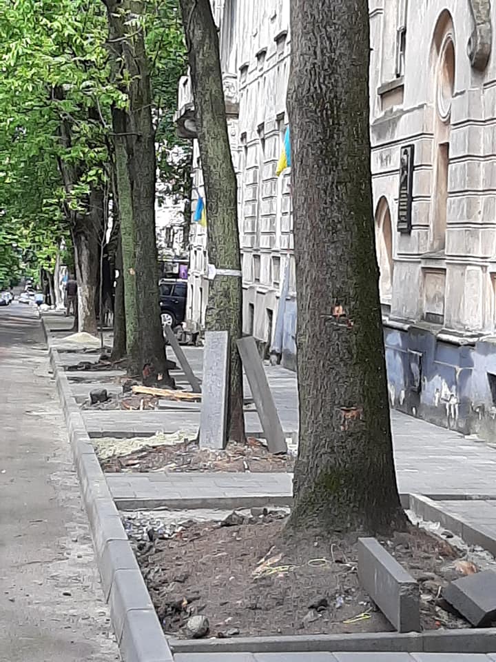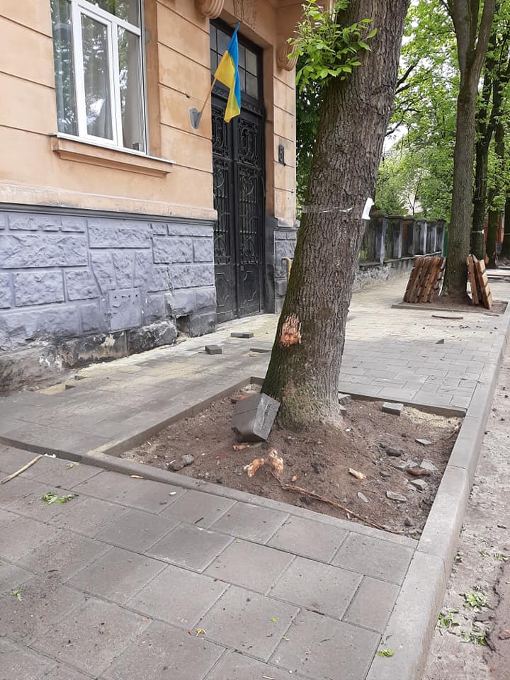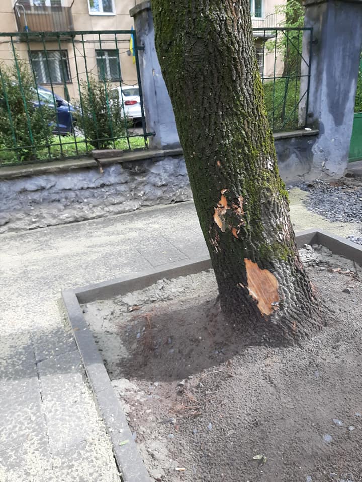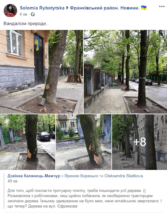 «Для того, щоб покласти тротуарну плитку, треба пошкодити усі дерева. Розмовляла з робітниками, щойно побачила, як необережно тракторцем зачіпали дерева. Їхньому здивуванню не було меж, наче китайською зверталася. І що тепер? Дерева на вул. Єфремова», – зазначається у дописі Дзвінки Калинець-Мамчур, яка оприлюднила світлини з місця події.