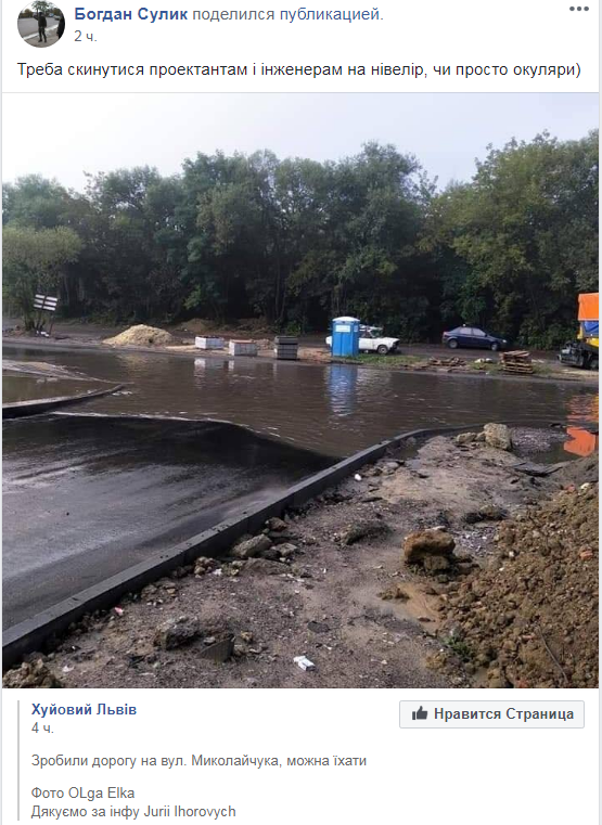 У Львові після ремонту вулиці Миколайчука (Шевченківський район) дорогу залило водою. Городяни у соцмережах обурюються якістю ремонту доріг у місті і пропонують “скинутися проектантам і інженерам на нівелір, чи просто окуляри”.