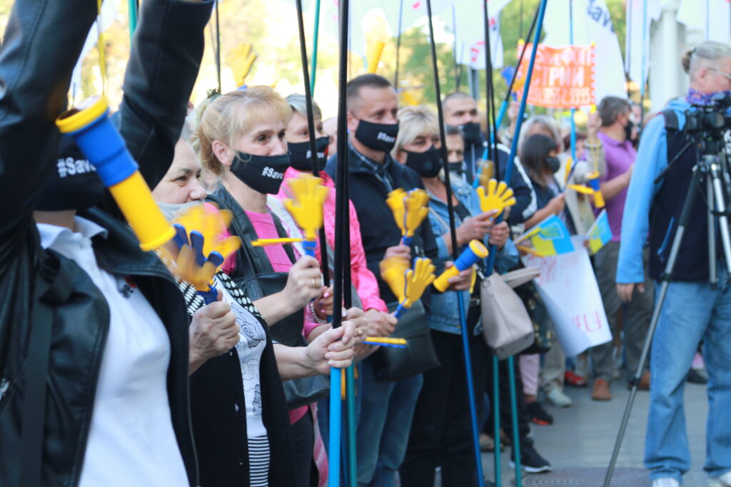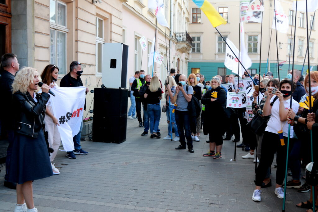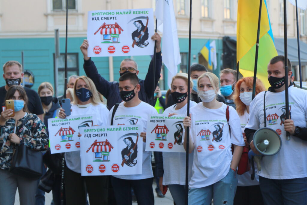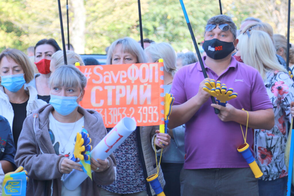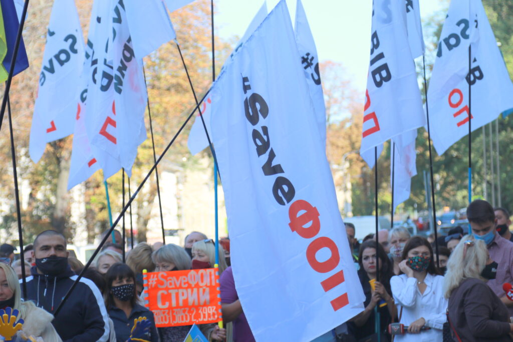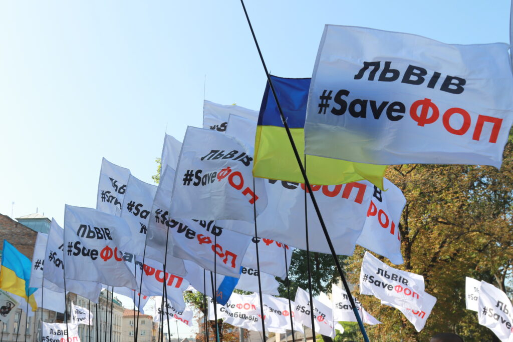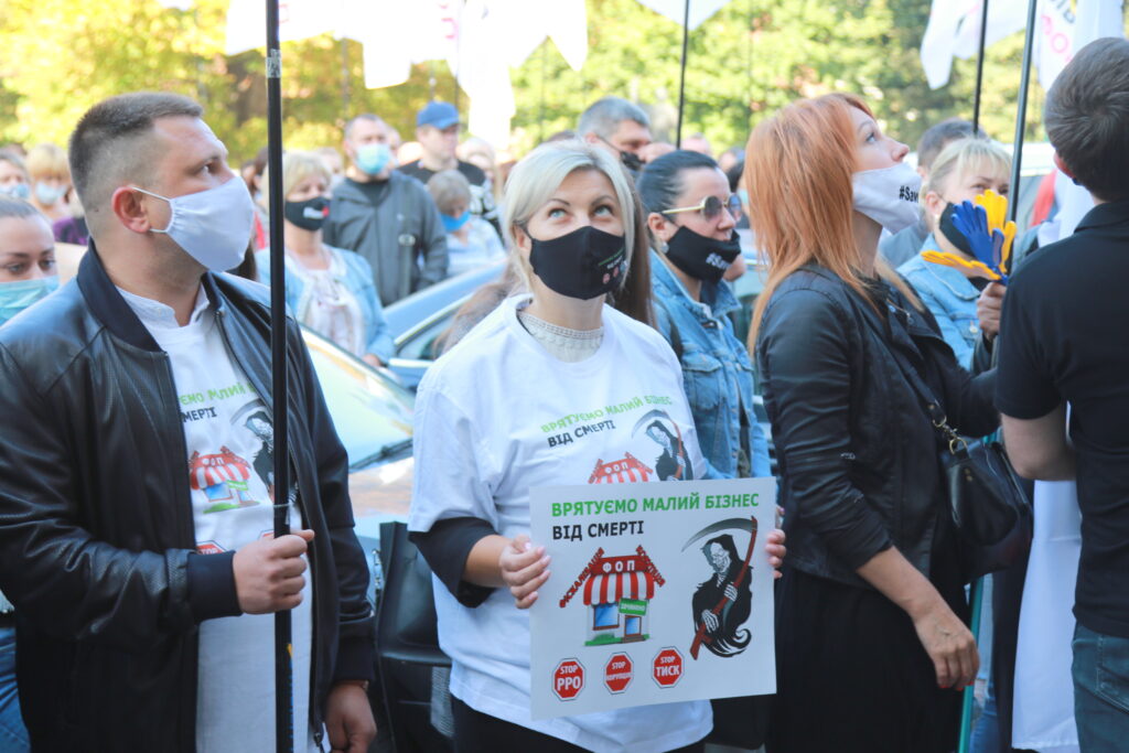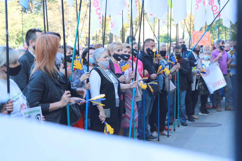 Активісти принесли з собою десятки плакатів та прапорів та закликали владу не знищувати малий та середній бізнес, зокрема, ФОПів, недолугими рішеннями.