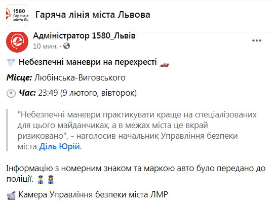 «Небезпечні маневри на перехресті. Місце: Любінська-Виговського. Час: 23:49 (9 лютого, вівторок). “Небезпечні маневри практикувати краще на спеціалізованих для цього майданчиках, а в межах міста це вкрай ризиковано”, – наголоcив начальник Управління безпеки міста Діль Юрій. Інформацію з номерним знаком та маркою авто було передано до поліції. Камера Управління безпеки міста ЛМР», – зазначається у коментарі до відео.